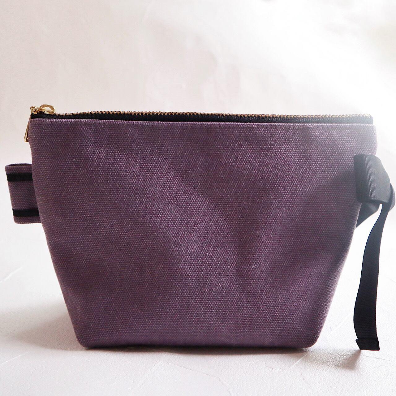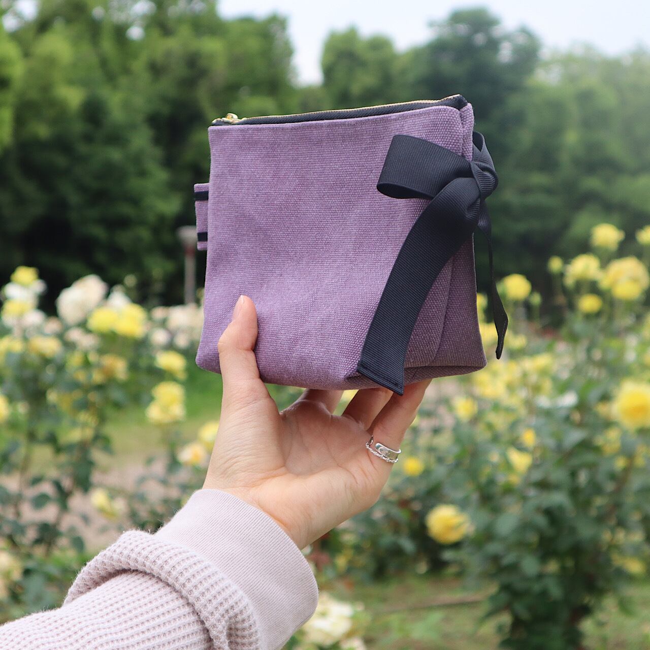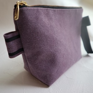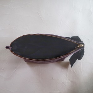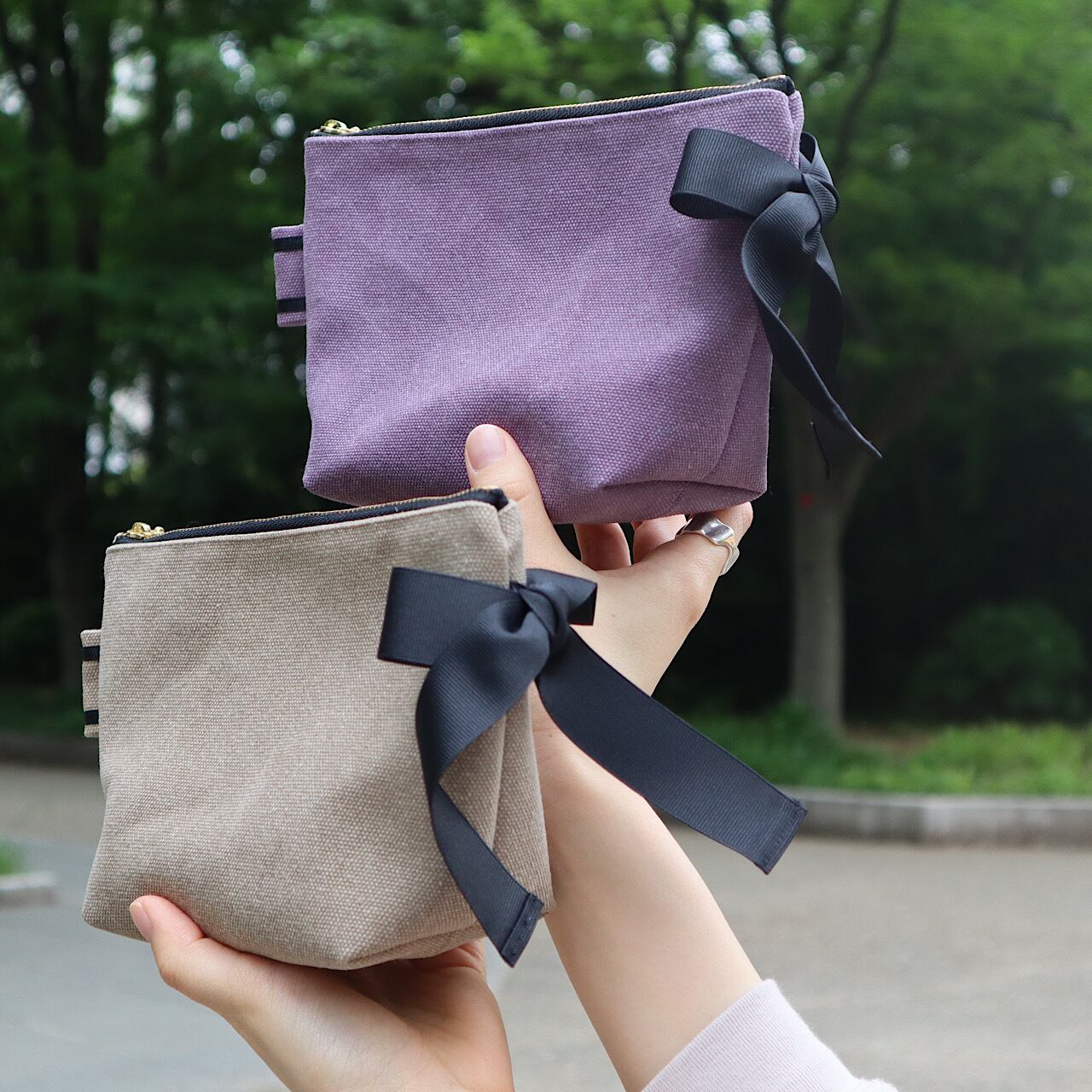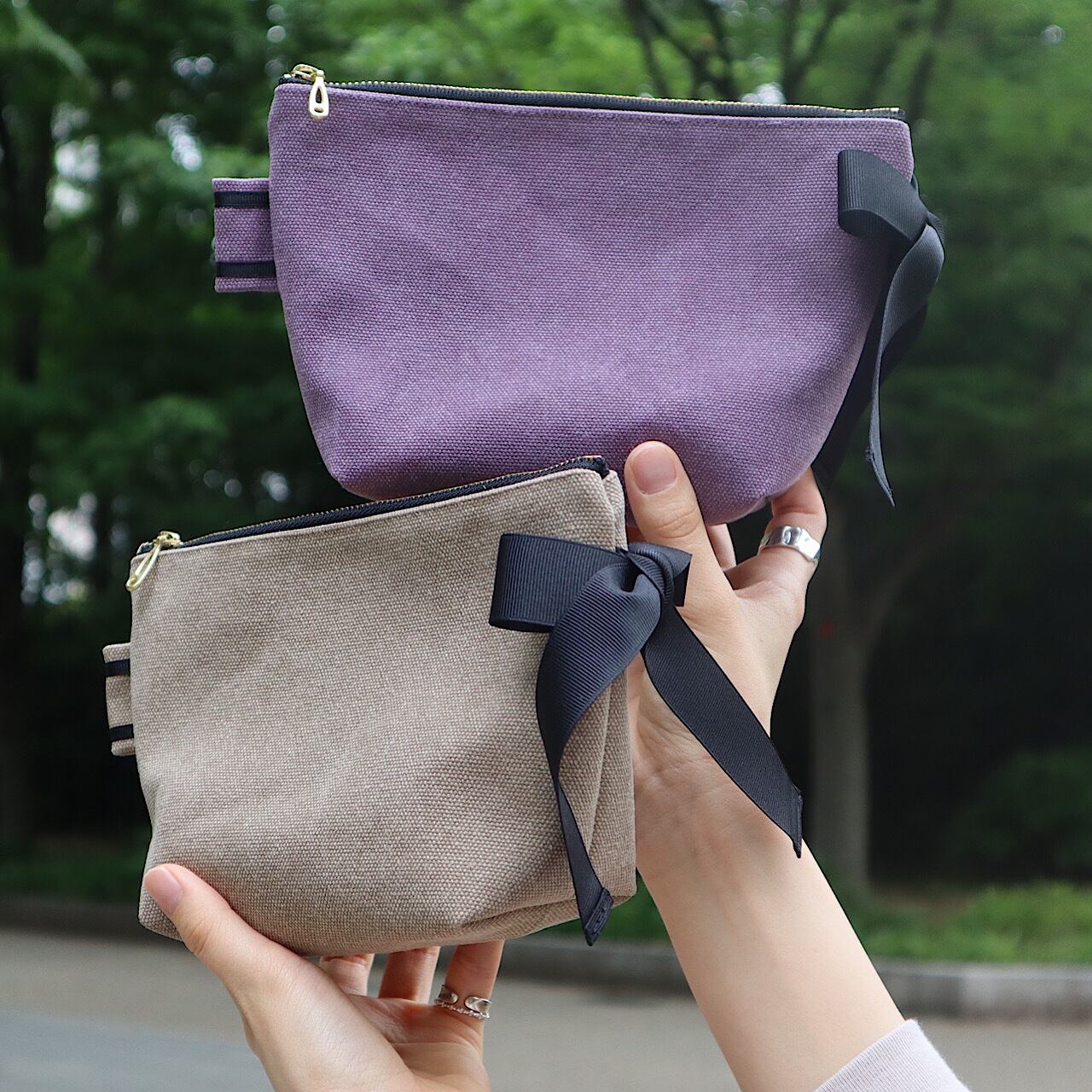 シンプルな見た目ながら、ダブルラインのタブ、グログランリボンでワンランク上のポーチとなっております。
