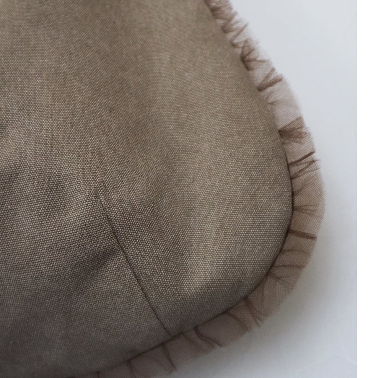 1.5センチ幅にカットした細かいギャザーを寄せたチュールをバッグのまわりにぐるりとつけた卵型のビッグバッグです。