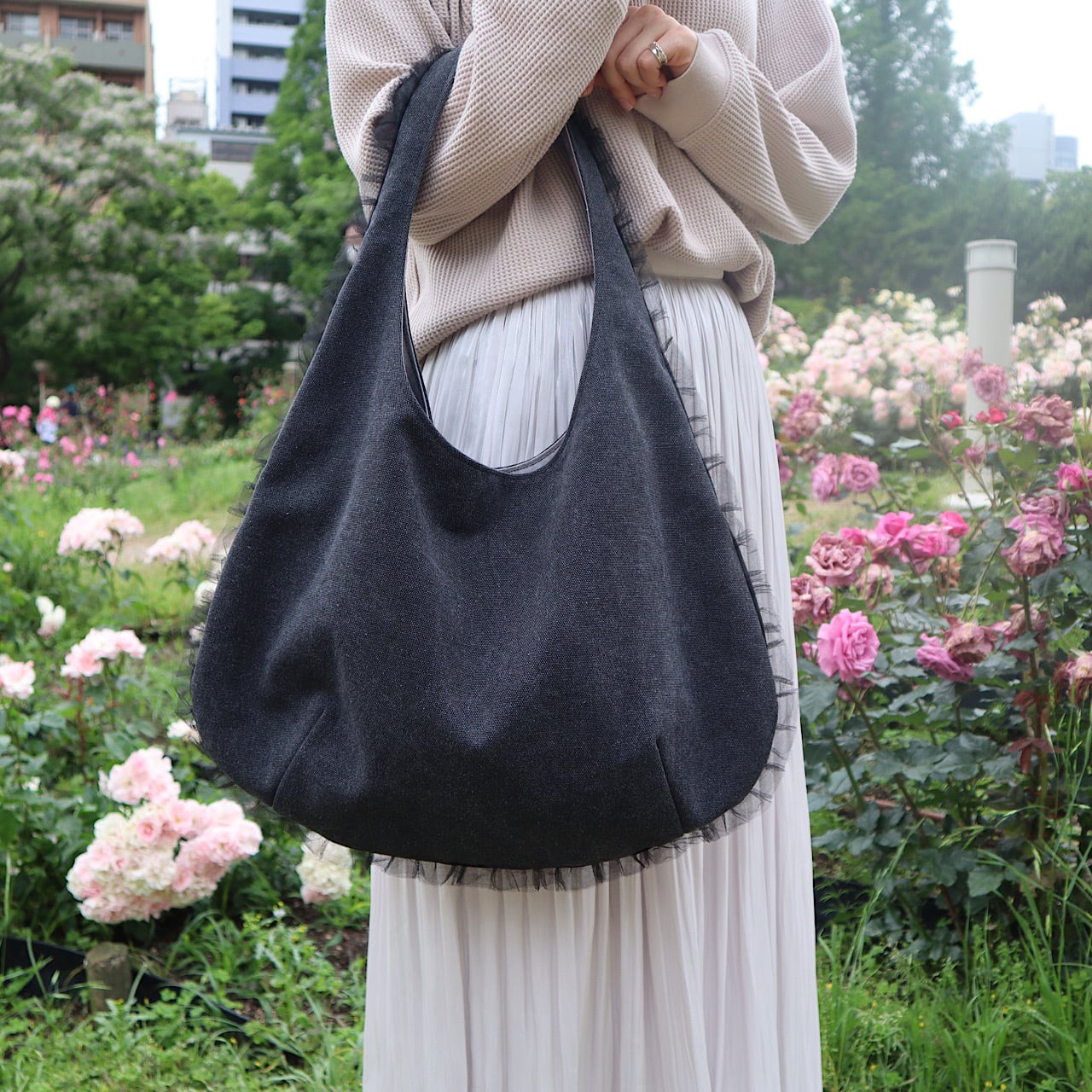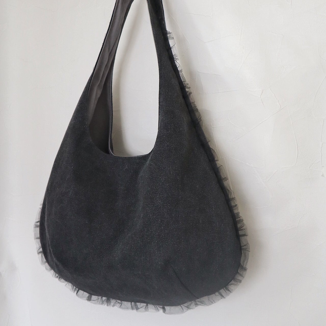 1.5センチ幅にカットした細かいギャザーを寄せたチュールをバッグのまわりにぐるりとつけた卵型のビッグバッグです。