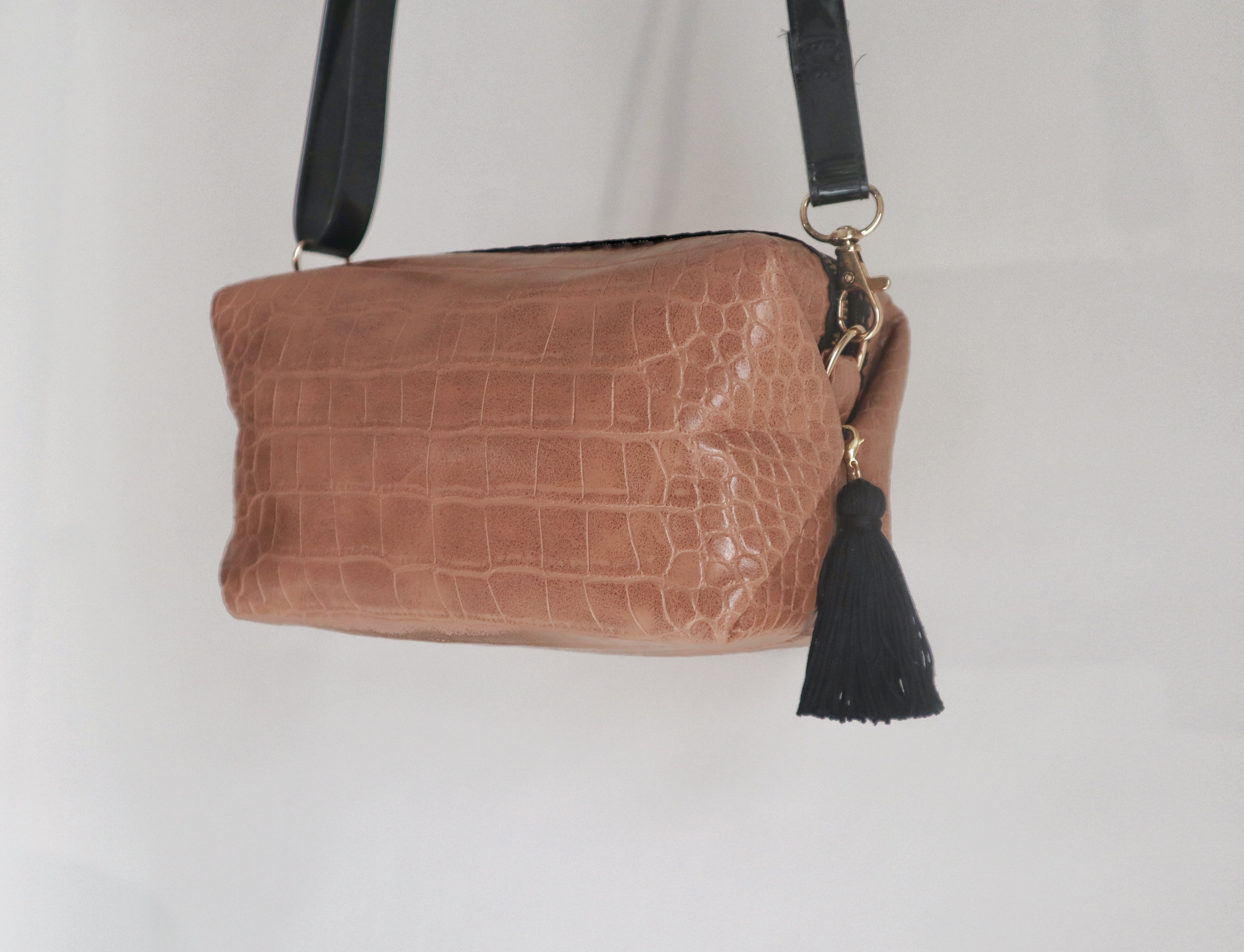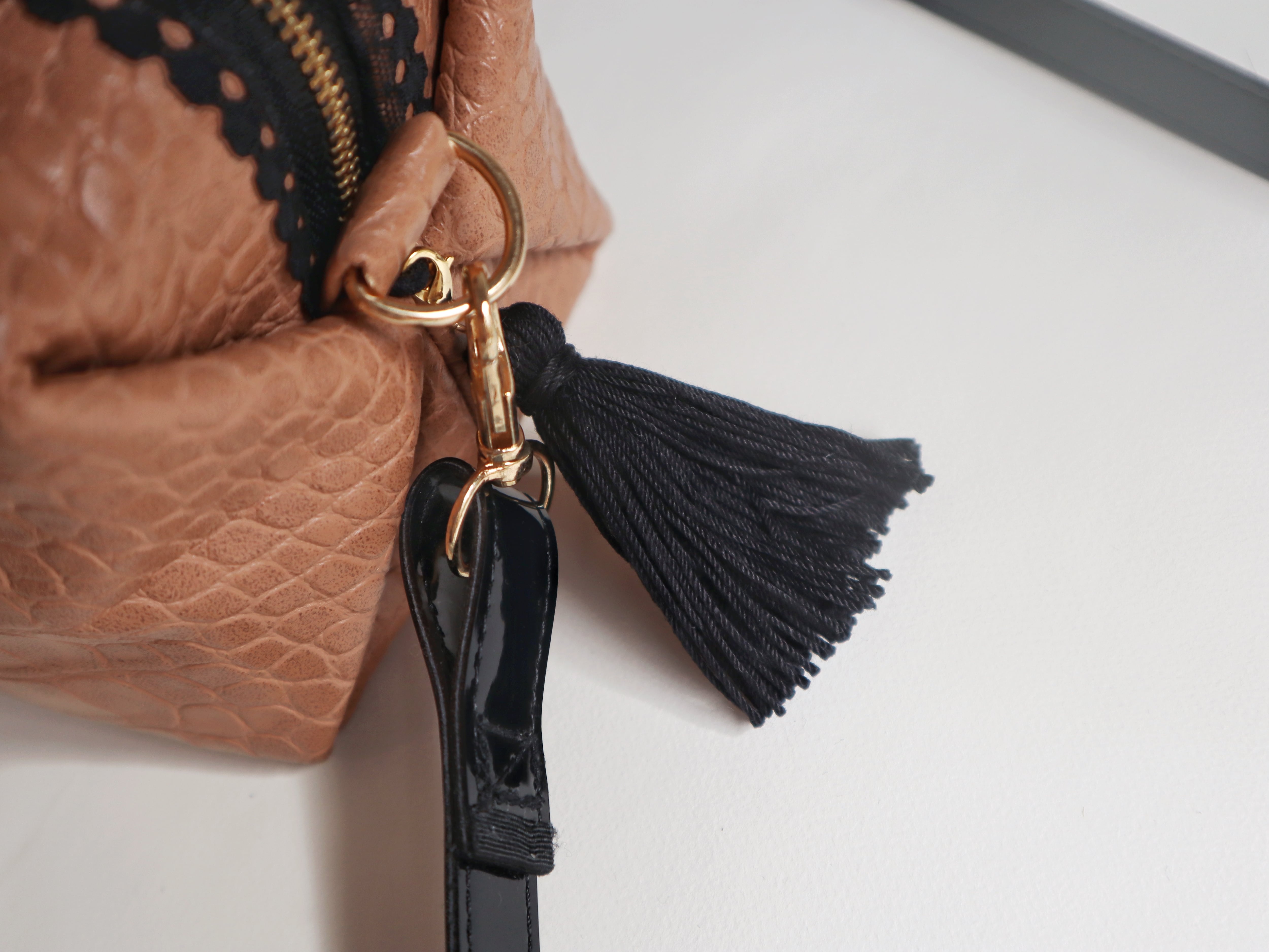 柔らかいキャメルの少しハードなクロコ合皮に、ドットが目を引くレースをあしらいました。