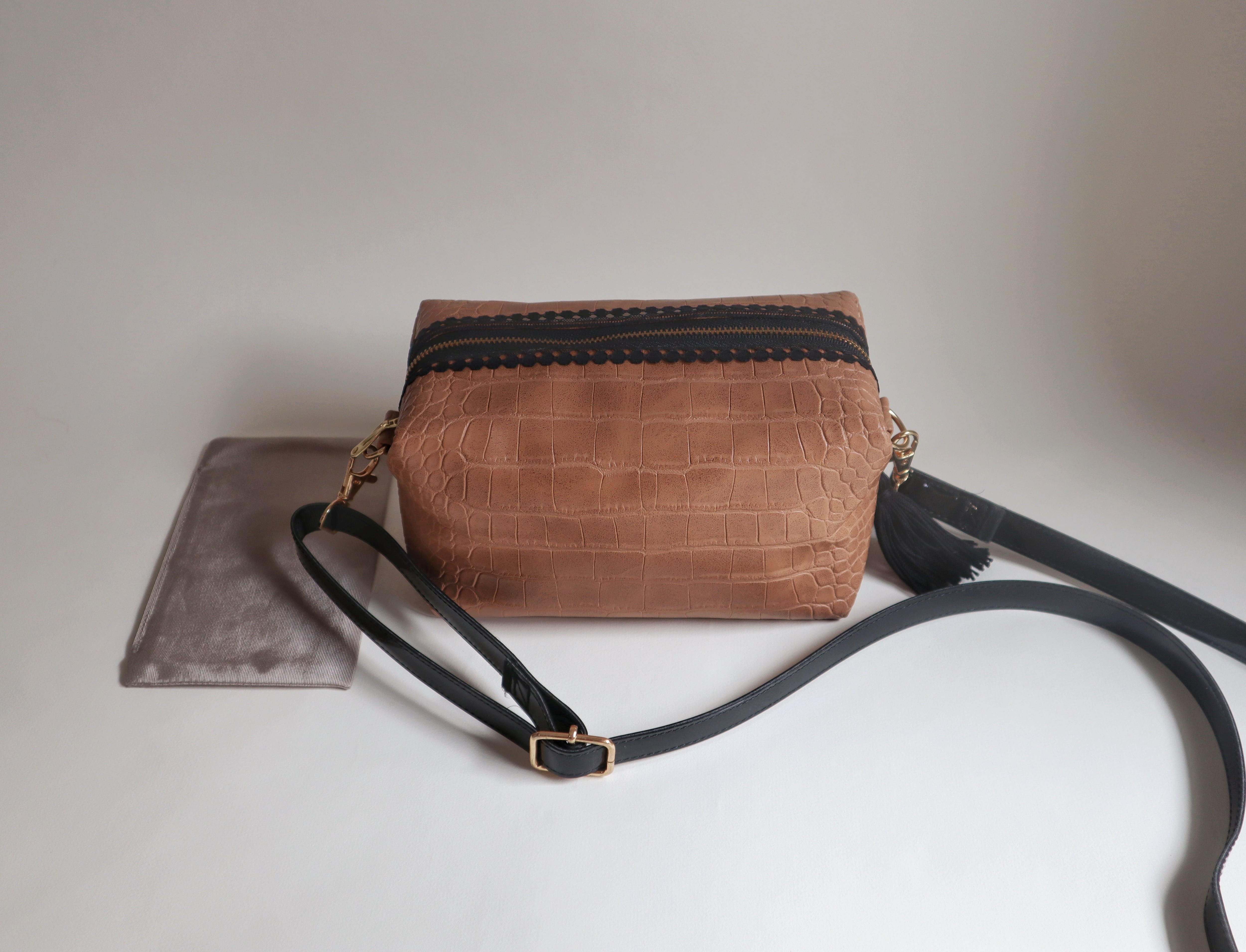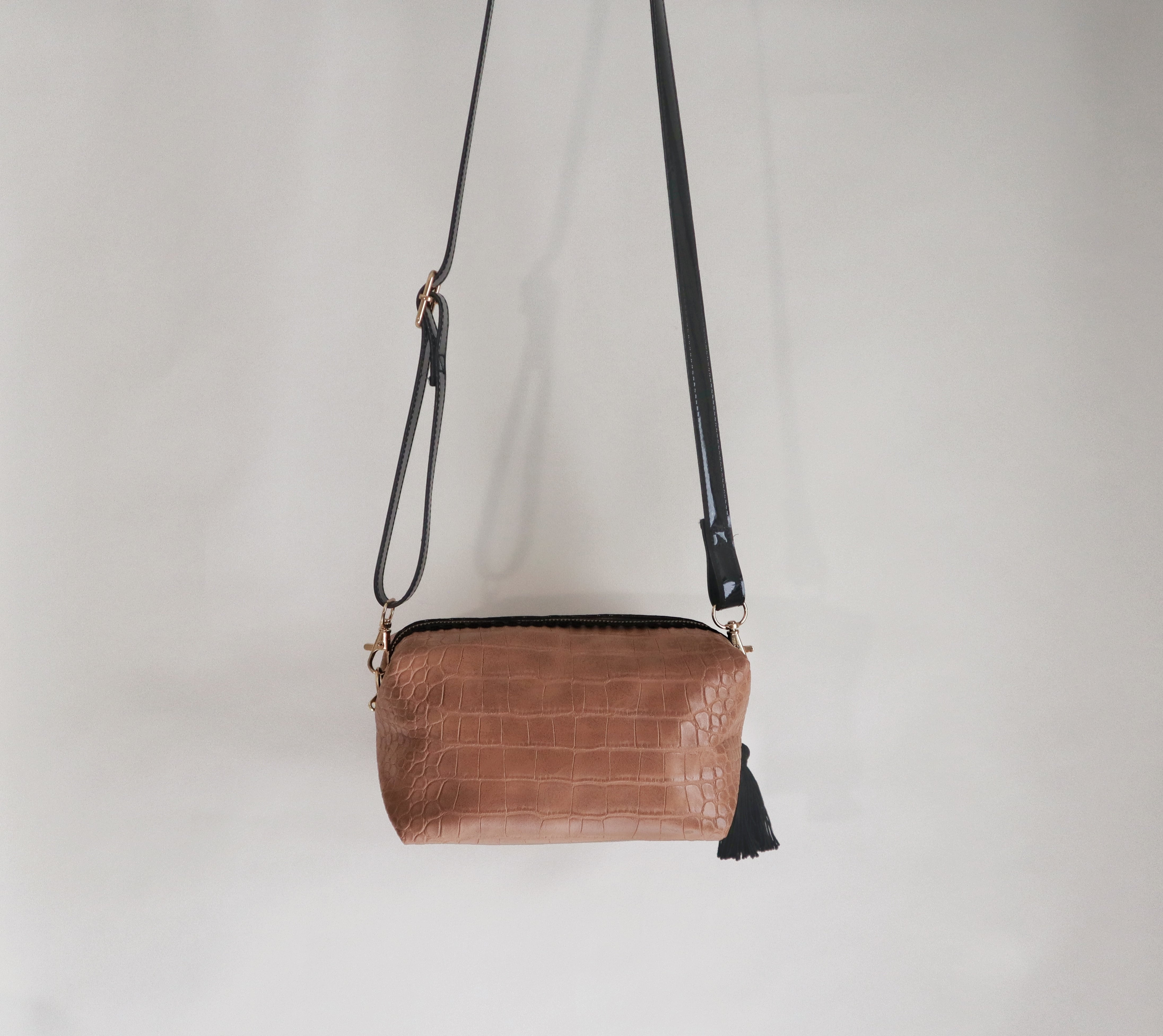 取り外し可能、長さ調節可能なエナメルショルダー付きのキャラメルショルダーポーチです。