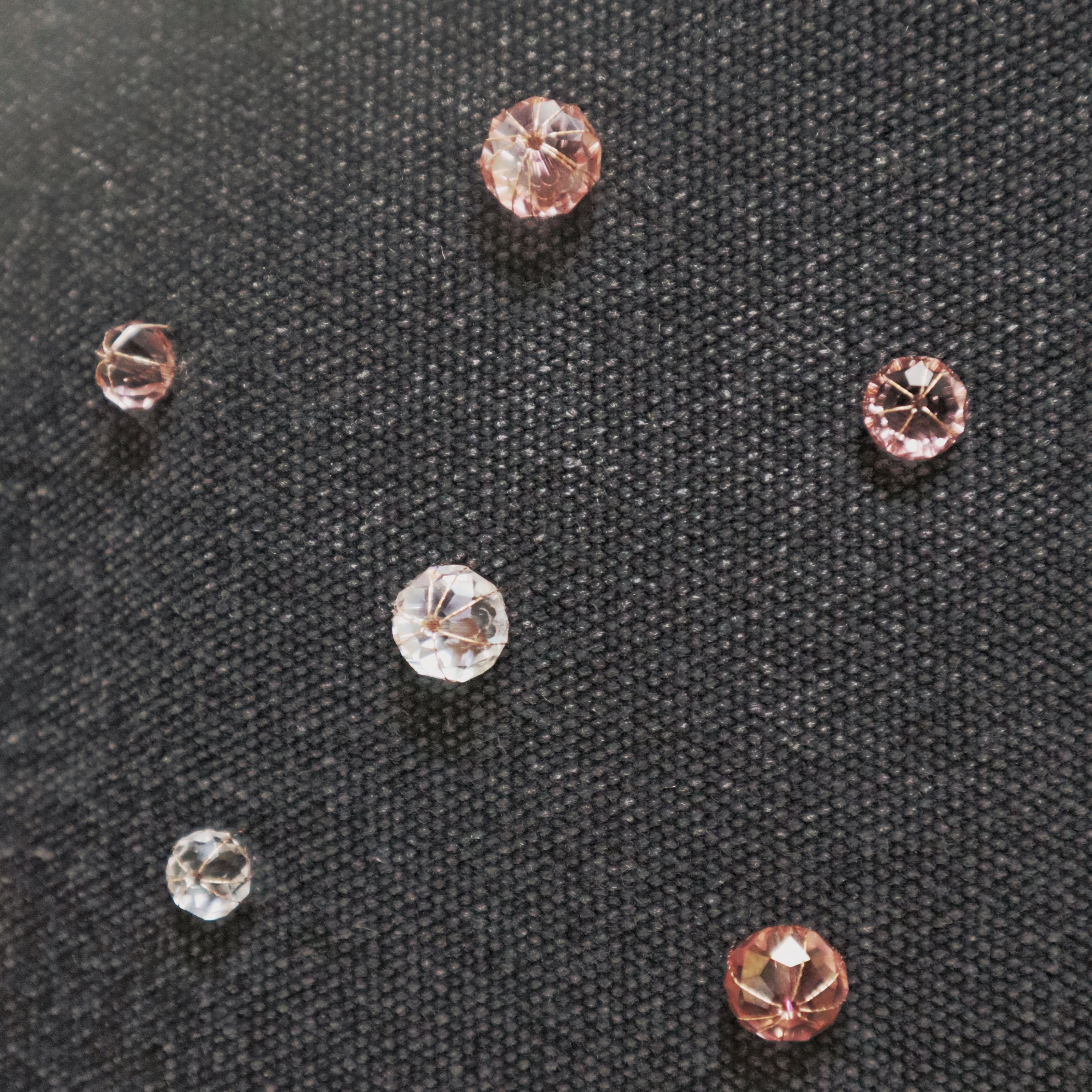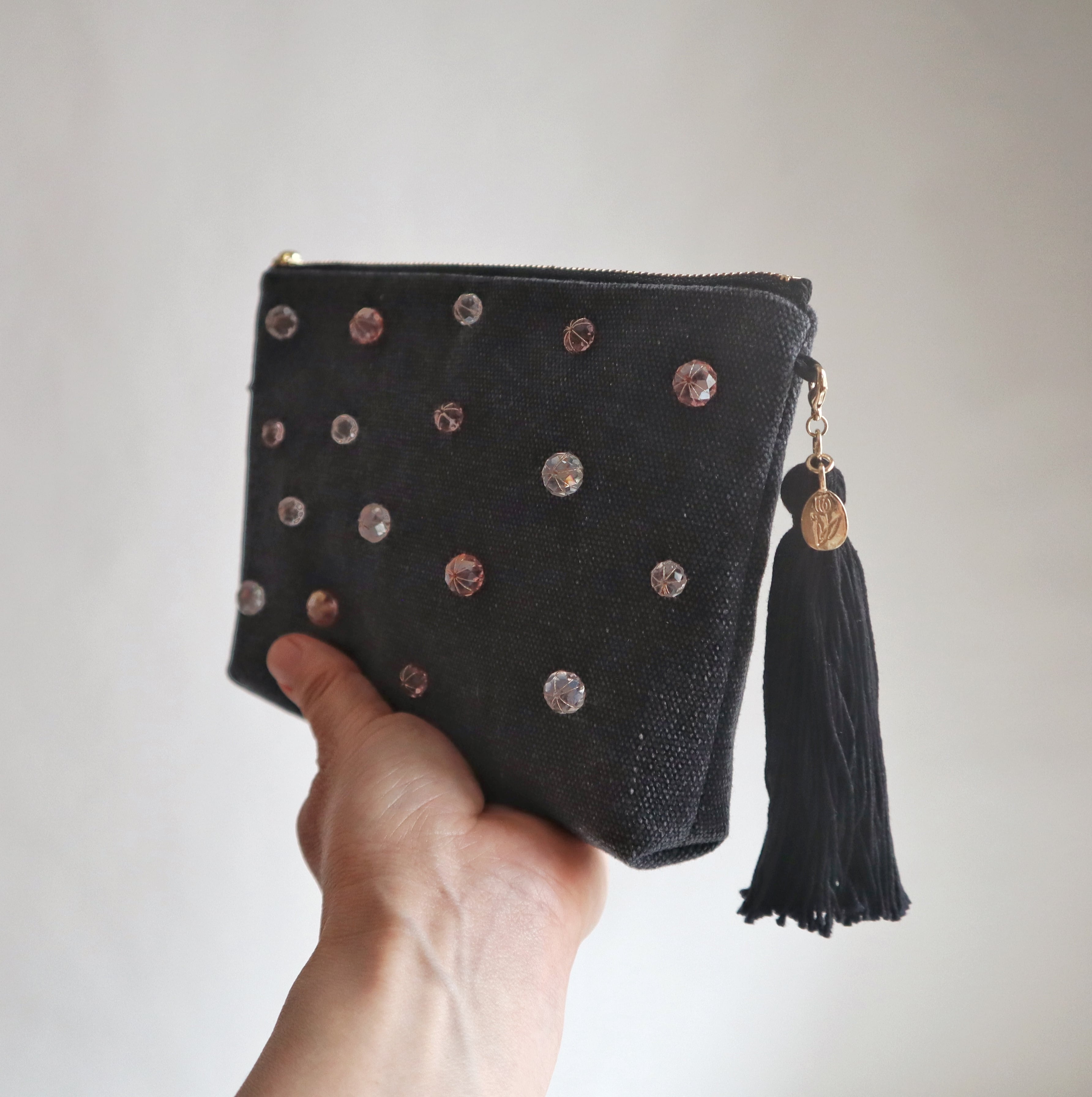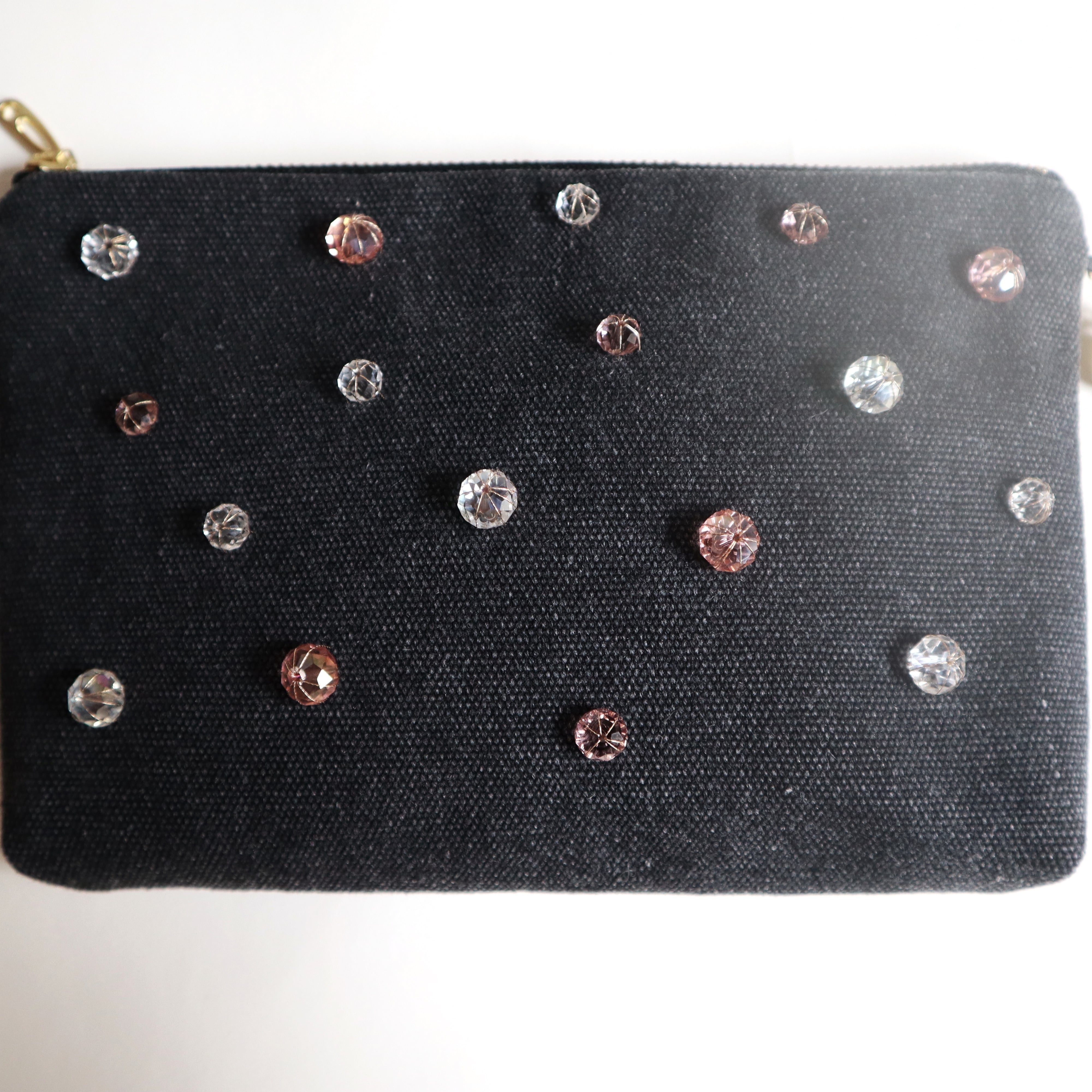 グログランリボンの持ち手付き 黒の帆布に淡いピンク、クリアのガラスビーズを金色の糸で縫い付けました。