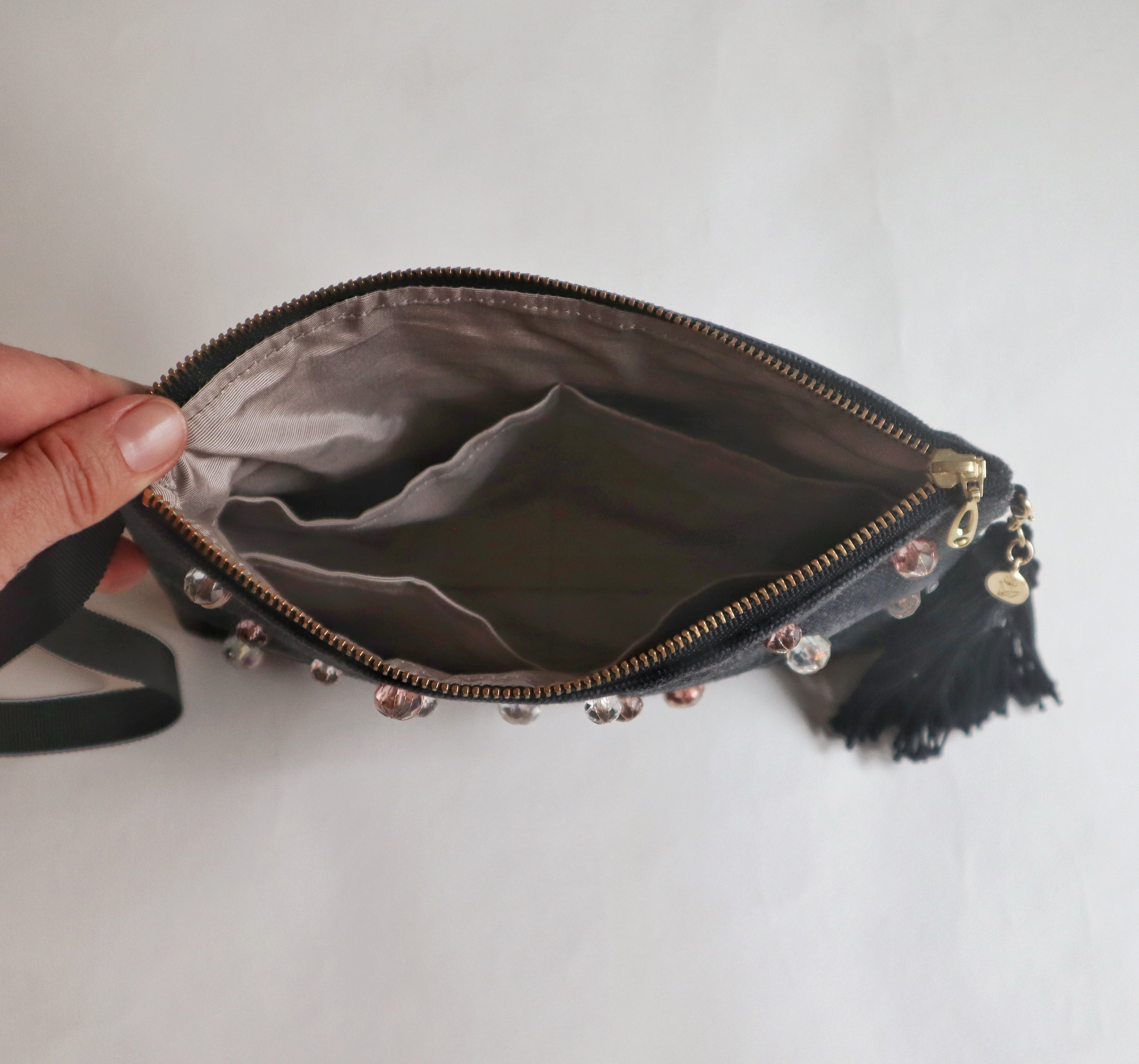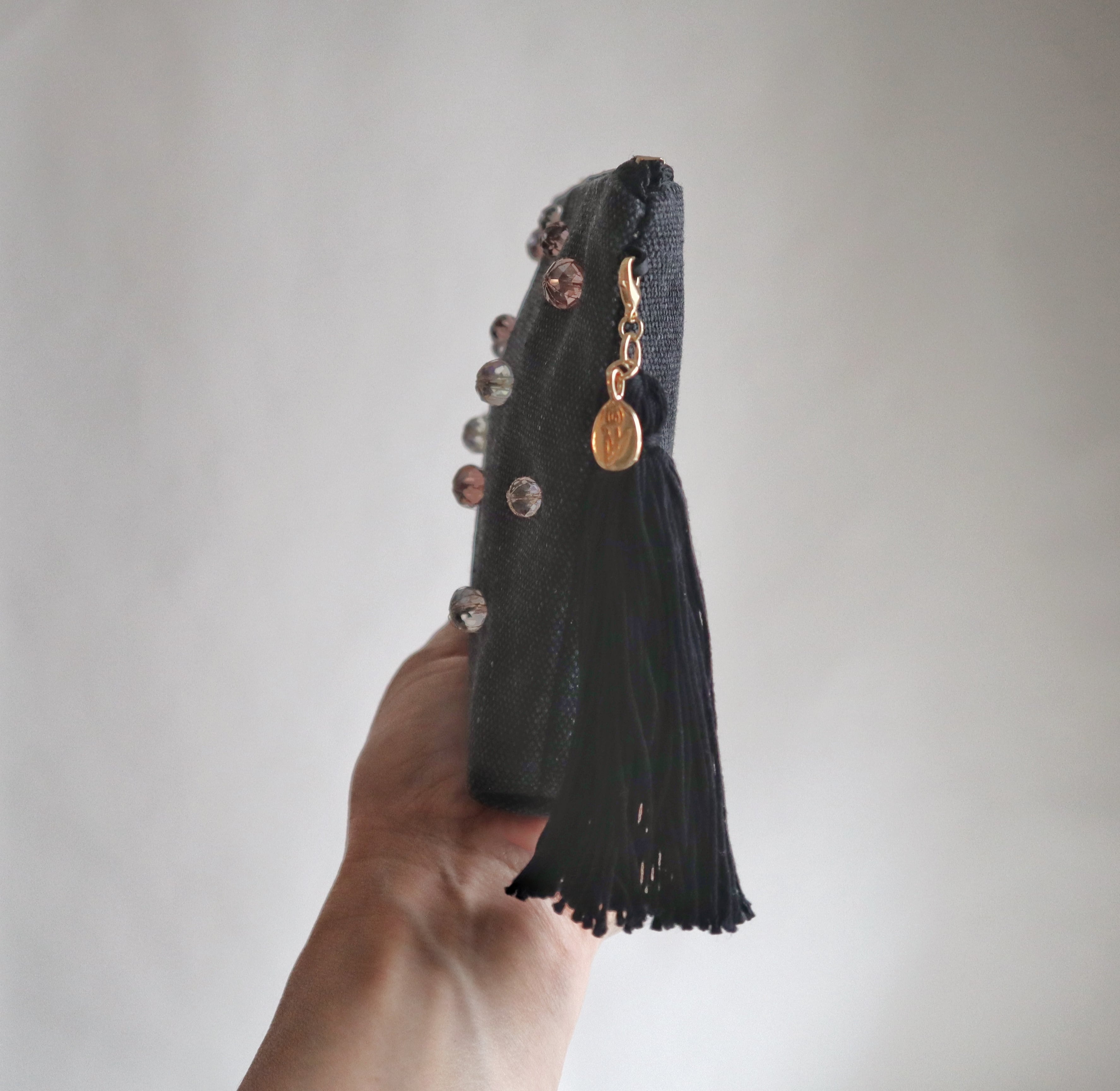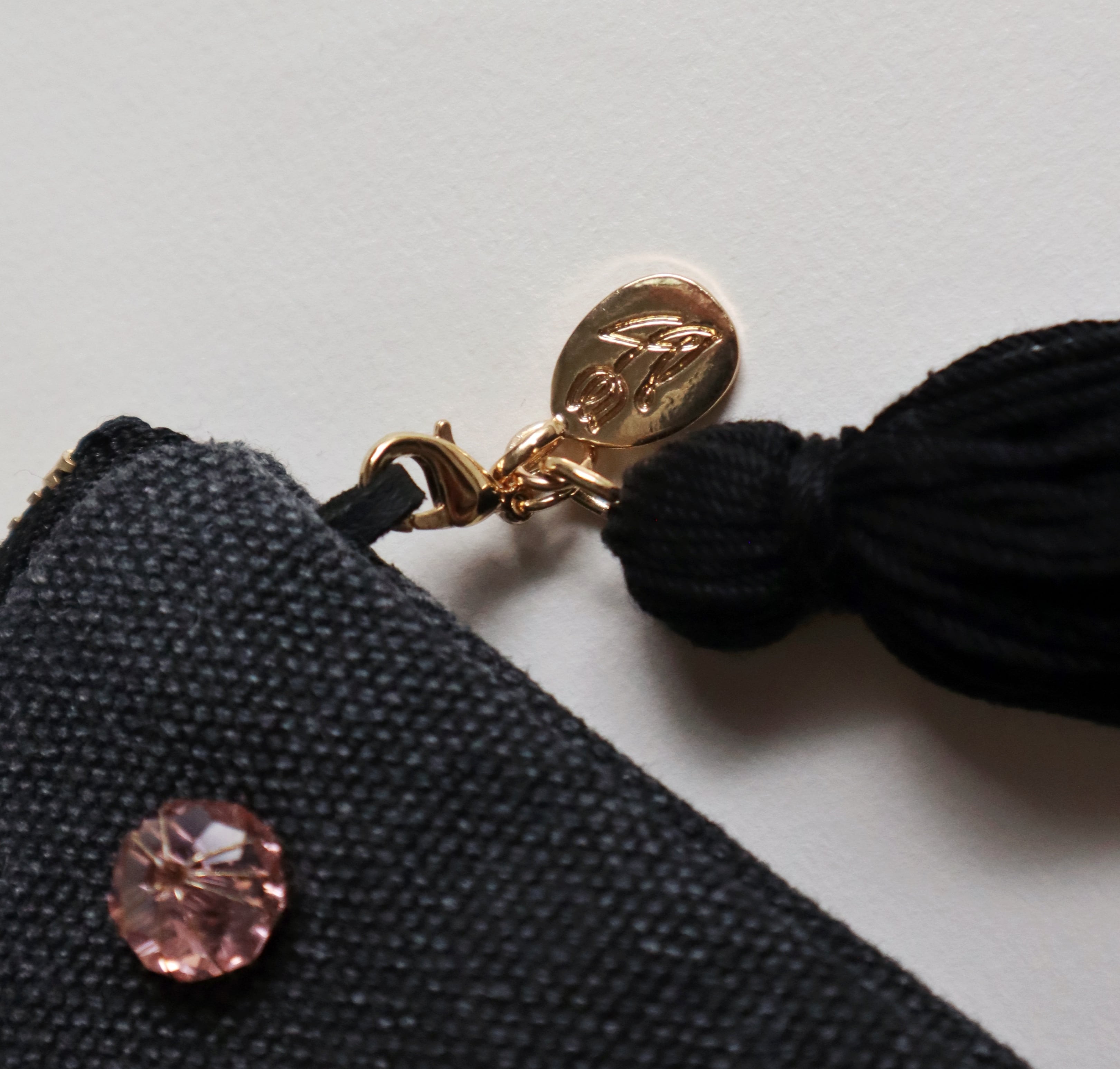 グログランリボンの持ち手付き 黒の帆布に淡いピンク、クリアのガラスビーズを金色の糸で縫い付けました。