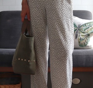 両サイド表裏にカーブに施したスタッズが目を引く手さげトートです。