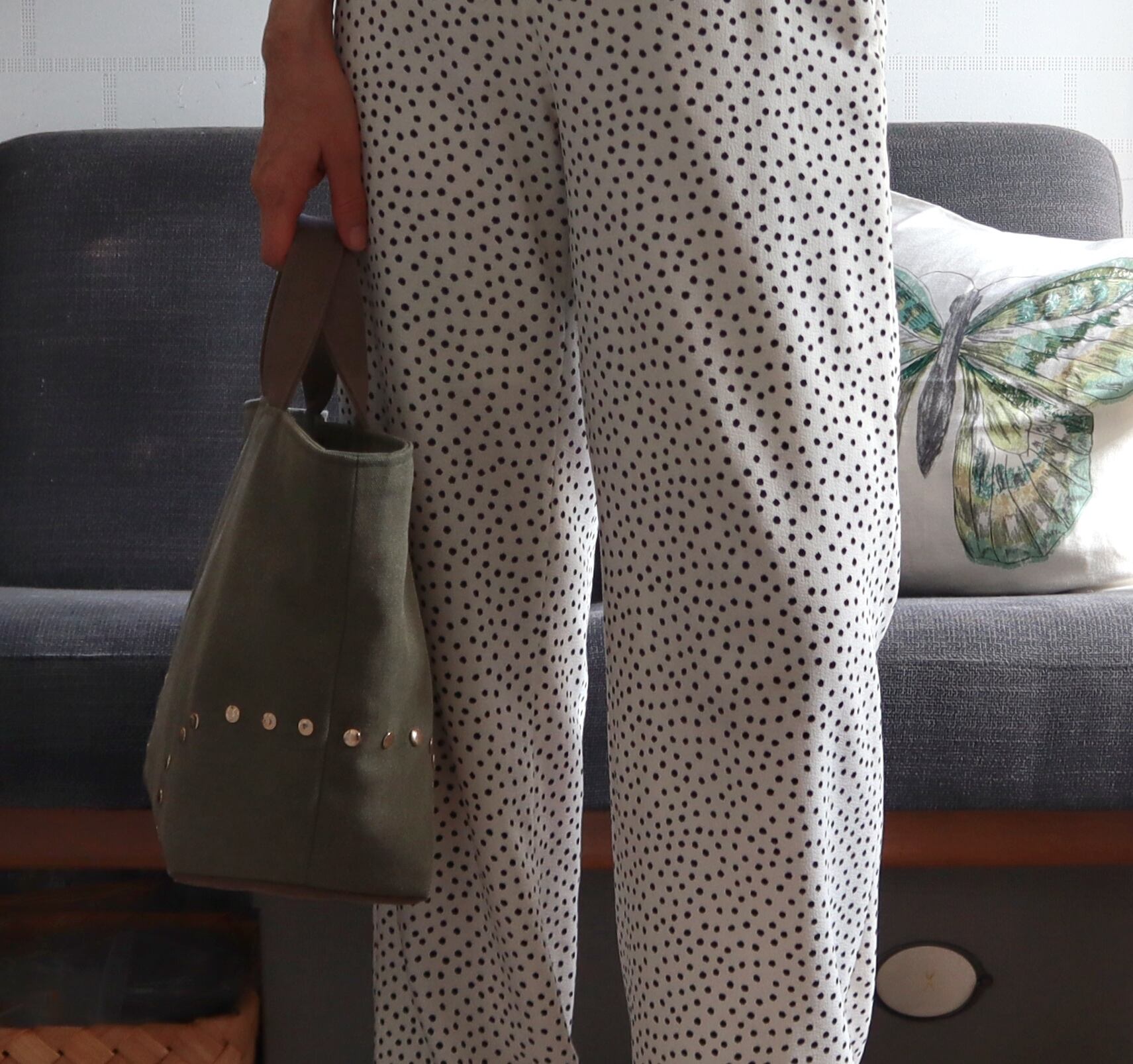 短めの持ち手がすごく手になじみ、手さげとしても、ひじにかける事も出来ます。
