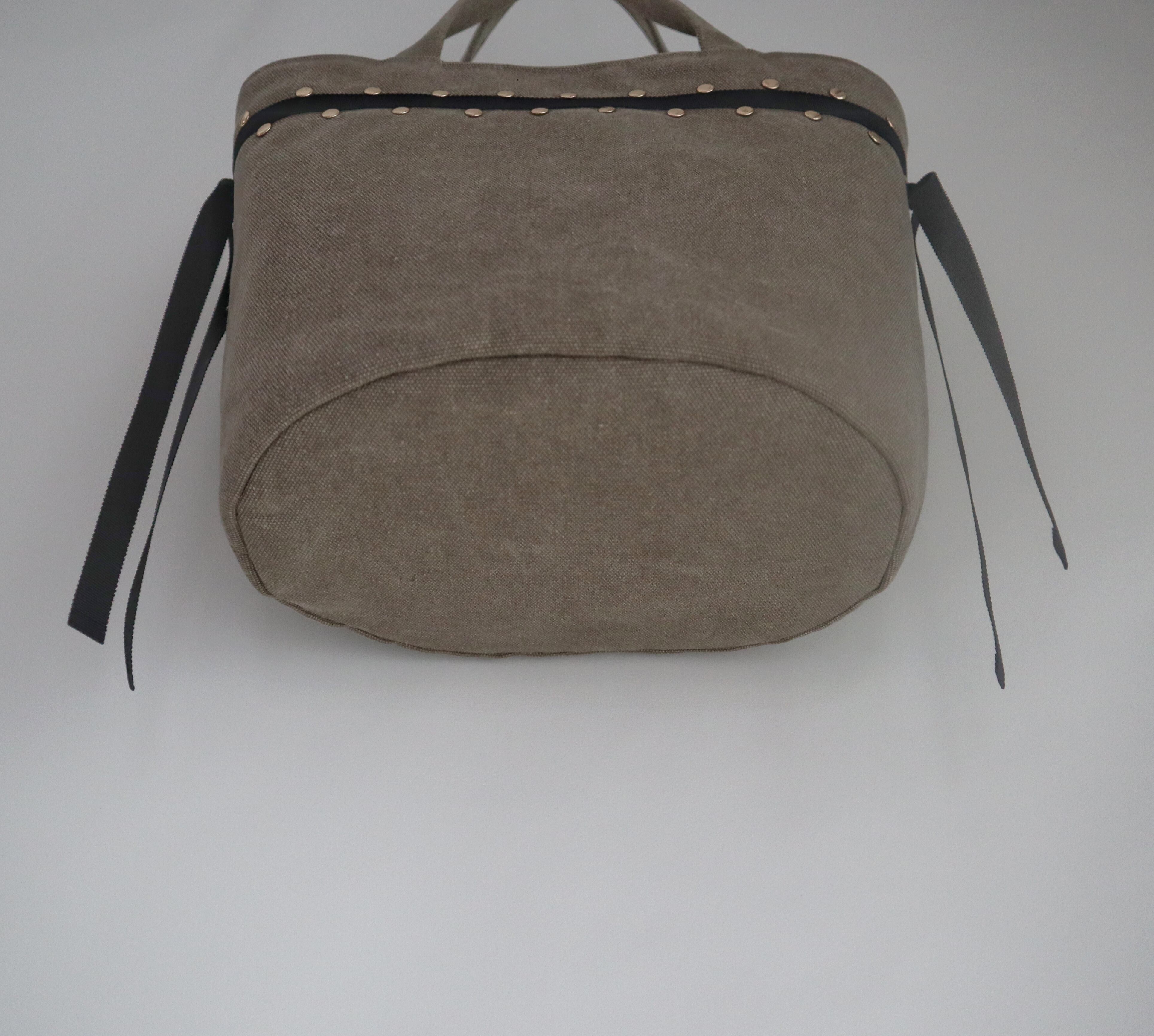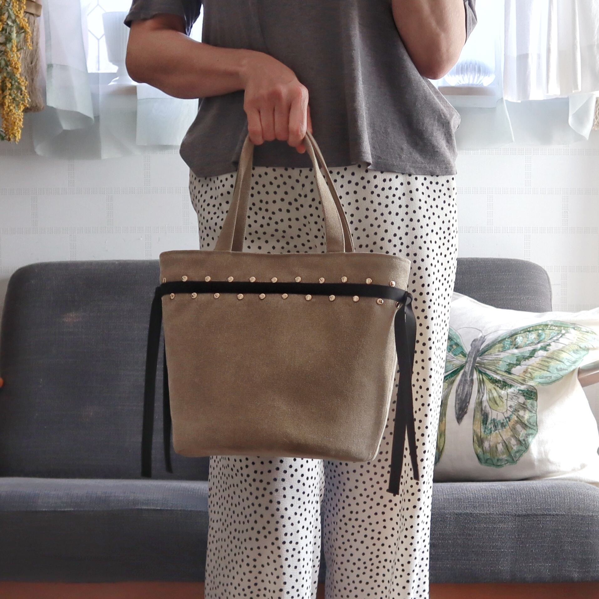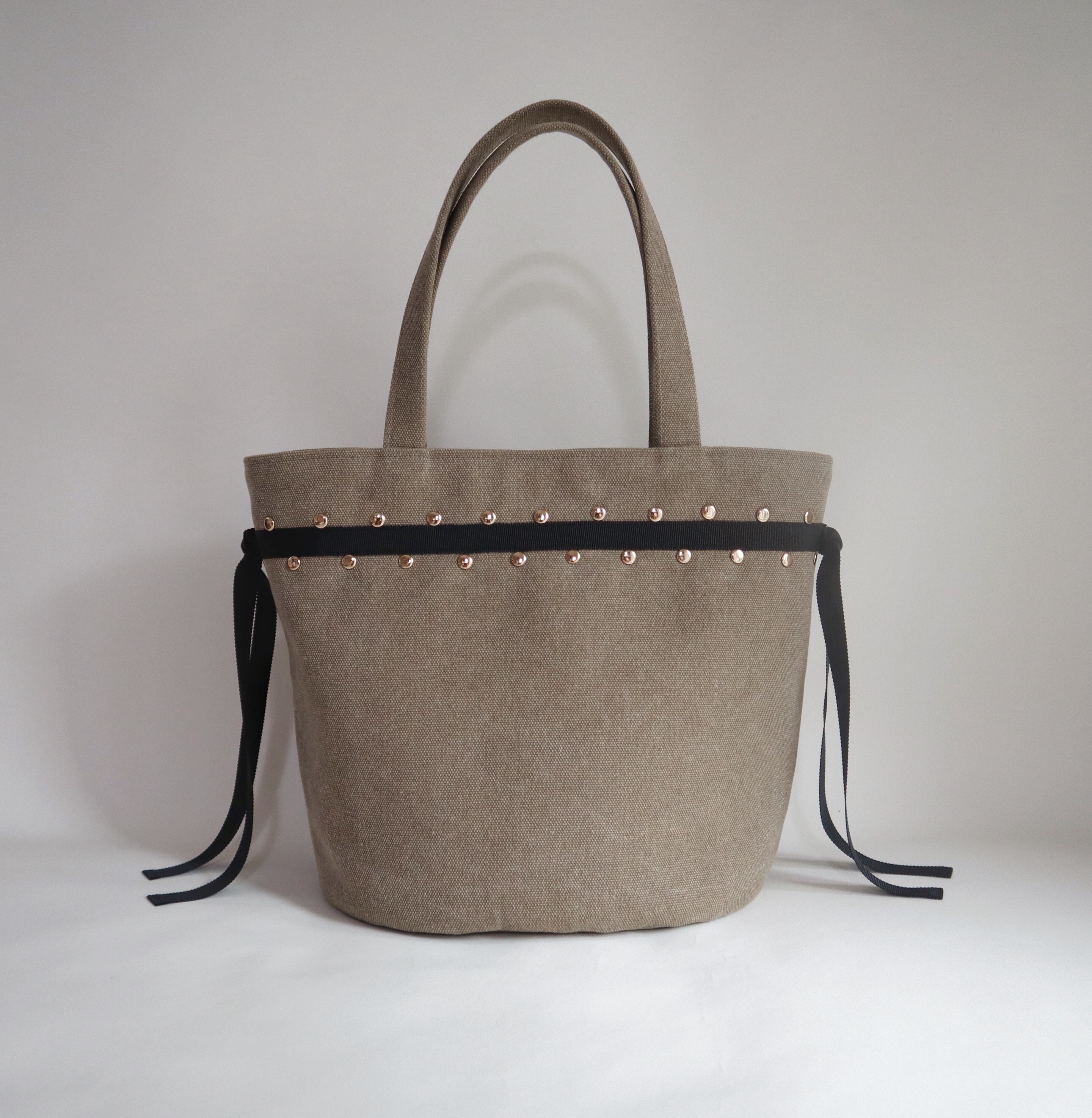 帆布、グログランリボン、スタッズという異素材の組み合わせでオリジナル感のあるトートとなります。